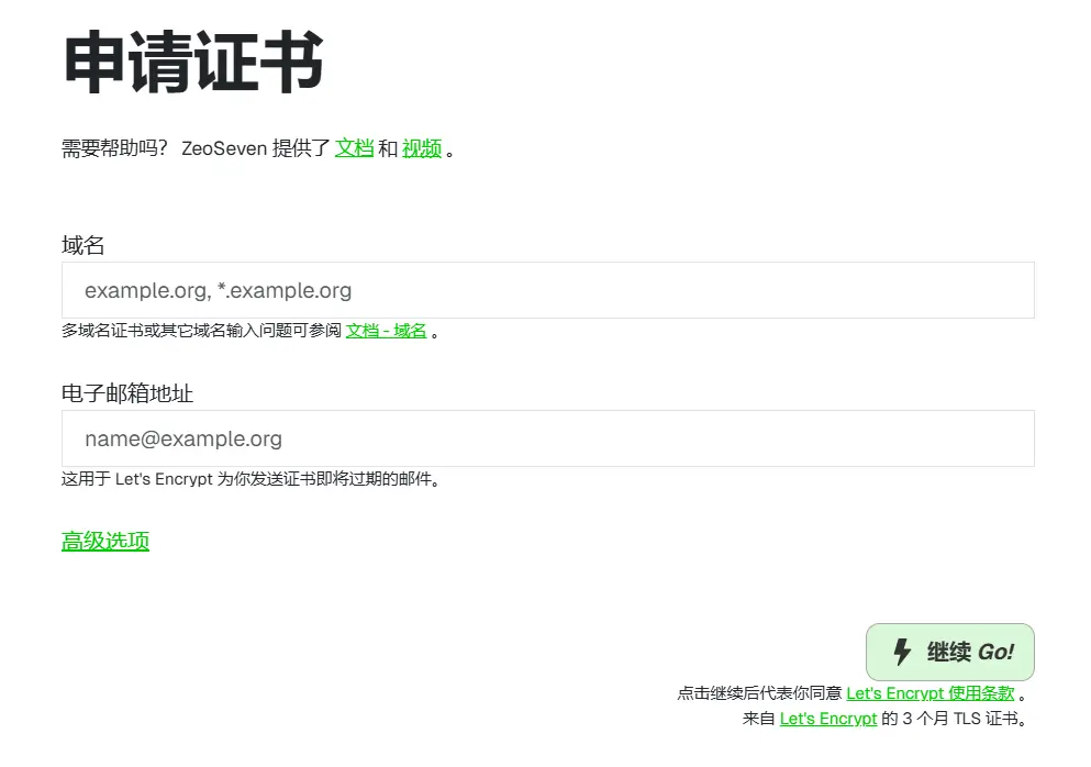 域名填写裸域,比如 example.org, *.example.org 即可申请覆盖主域 example.org 及子域 blog.example.org、bbs.example.org 等域名的 TLS/SSL 证书。