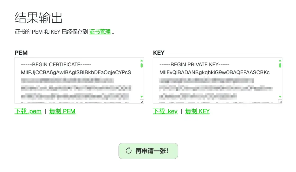 如果一切顺利,您应该会看到 PEM 和 KEY 的输出页面: